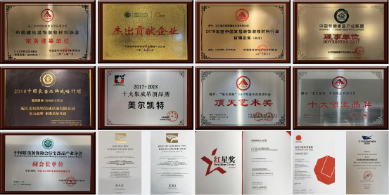 美爾凱特高端廚衛吊頂已經走過19年的發展歷程,在品牌、產品、品質、規模上已經成長為行業的標桿企業。作為專注廚衛集成吊頂的高端品牌,已連續榮獲中國廚衛百強企業、廚衛吊頂行業十強企業等榮譽稱號,先后被授予了中國集成吊頂十大領軍品牌等眾多榮譽,并成為浙江省省級個性化定制示范試點培育企業,已成為中國高端集成吊頂行業的領導者。